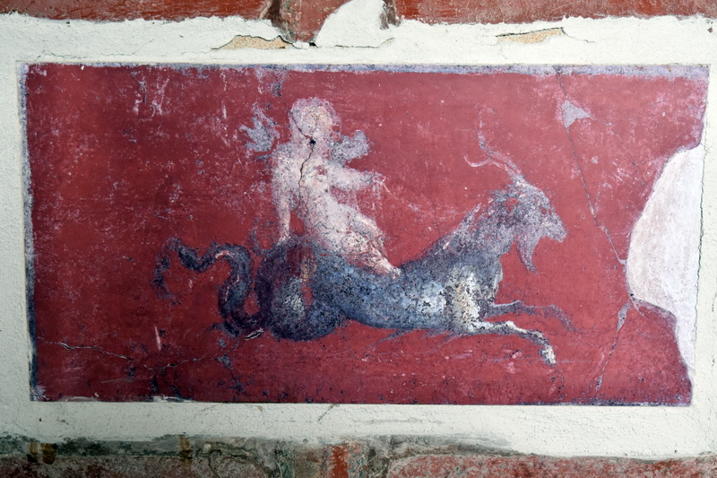 In the same period the facing cubicle (10), painted yellow, also provided the Museum in Naples with some frescoes of satyrs and reclining warriors. From its floor centre a square emblem was removed, but so far it hasn’t been possible to find out its location. The diaeta (9), with a window opening on to the Gulf, reveals a special mosaic wall-decoration consisting of rhomb’s, within which birds, flowers, female figures, medallions and cupids alternate. Largely removed in the 18th century, it was variously remounted in the Naples Museum, where it stands to this day.