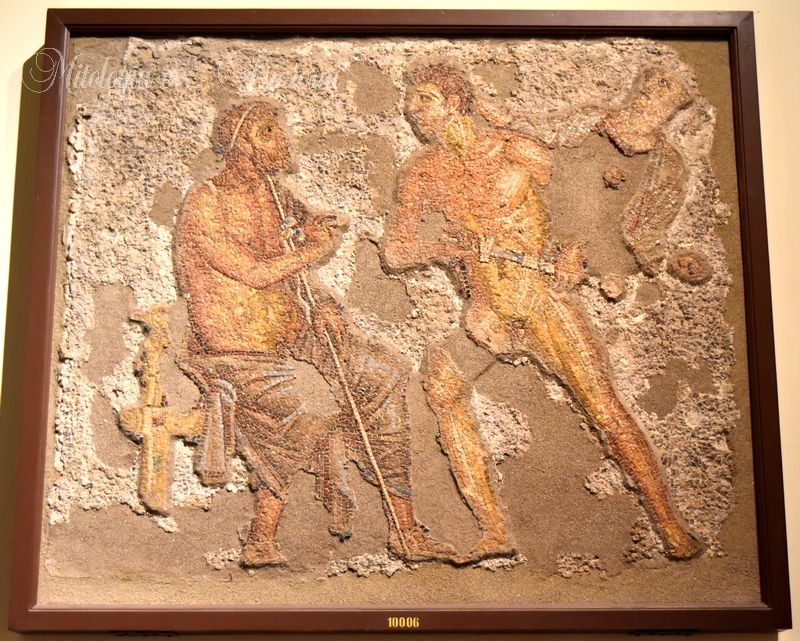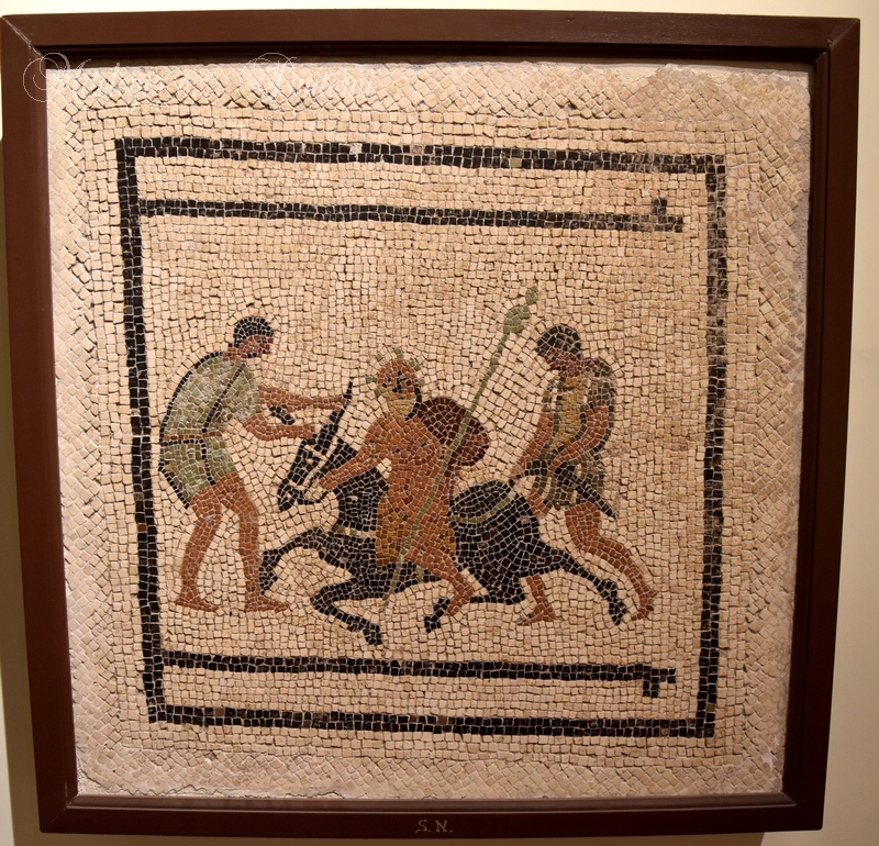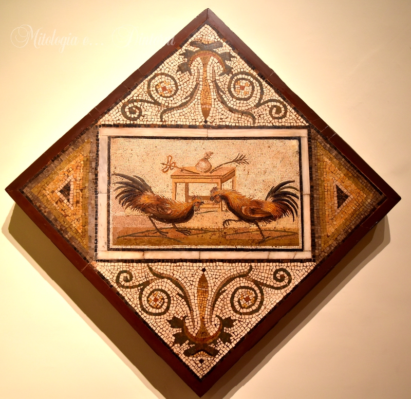 The mosaic collection is composed of pavements and rarer wall mosaics which come mainly from Pompeii, Herculaneum and Stabiae. It reflects the criteria of eighteenth and nineteenth century collecting which, conditioned by antiquarian interests, was directed towards the recovery of “beautiful” and representative objects, of ten neglecting all information’s regarding their original contexts. Such fashion, lasting for about a century, explains the presence in the collection of abundant emblemata. These are figured panels, almost always polychrome, which were originally inserted in the centre of some pavements and were far more complex than the surrounding mosaic. They were produced in workshops by specialized craftsmen who applied complex and refined techniques to realize what was, in effect, a painting in stone. It is now a generally accepted hypothesis that the earliest Roman emblemata, dating between the second and early first century B.C. (of which our collection contains abundant examples), are often faithful copies of long-lost Greek paintings.
