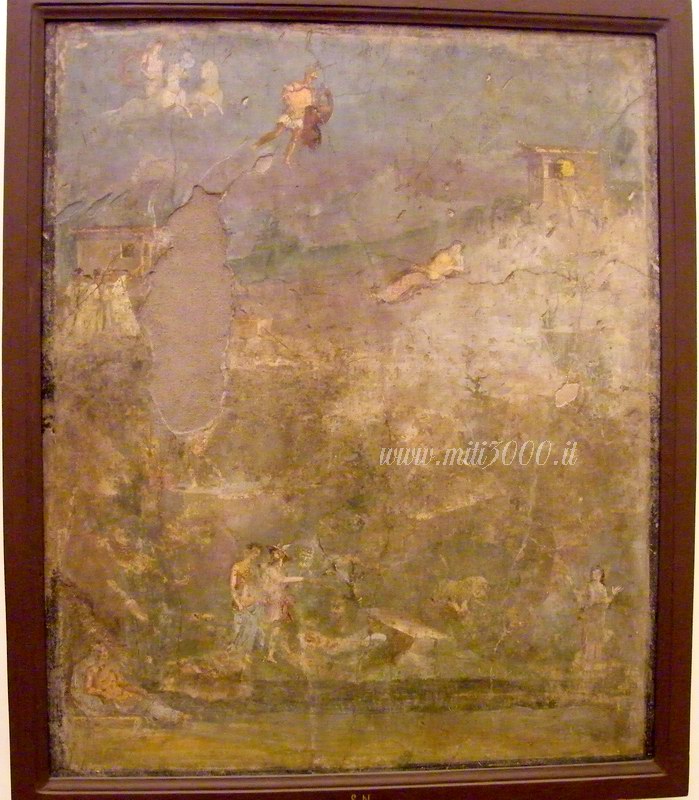 Si tende ad abbandonare le vicende il cui contenuto tragico e altamente morale, la punizione inflitta dagli dei a colui che si ribella ai limiti umani, non rendeva possibile una lettura diversa e più distesa, e COSÌ la storia di Icaro che precipita al suolo perché ha volato troppo vicino al sole, che era stata il soggetto di alcuni dei quadri più belli conservati o Pompei, nell'ultima fase della vita della città è presente in due soli esempi. Continua la diffusione di quadri con episodi legati alla guerra di Troia: dagli antefatti, come il Giudizio di Paride, alla preparazione, come i! sacrificio di Ifigenia, il ritrovamento di Achille a Sciro, la forgiatura delle armi dell'eroe e la consegna delle stesse a Teti, fino all'introduzione del cavallo nelle mura di Troia nonostante i funesti presagi di Laocoonte e Cassandra, fino alla notte dell'incendio, tutte dolorose indispensabili premesse perché Enea giungendo nel Lazio desse poi origine a Roma.