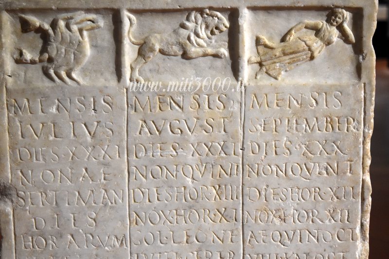 Il calendario arcaico comprendeva dodici mesi per 355 giorni. Era lunisolare: il succedersi dei mesi era basato sulle lunazioni, ma si colmava ogni due anni la differenza sulla rivoluzione terrestre con un mese intercalare di 22 o 23 giorni. La differenza era dunque colmata per eccesso, per cui talvolta era omessa l’intercalazione. Il compito di registrare le lunazioni e di ordinare le intercalazioni spettava ai pontefici, massima autorità religiosa romana. Il nostro calendario discende dalle riforme di Giulio Cesare (46 a.C.) e di papa Gregorio XIII (1582), fondate sul calcolo astronomico del periodo di rivoluzione terrestre. Il mese romano era diviso in tre parti: calende (abbreviate con Kal o K), none (Non), idi (Eid) che originariamente indicavano tre momenti della lunazione. La funzione delle nostre settimane era svolta dalle nundinae (“nove giorni”). Esse comprendevano in realtà otto giorni, e il loro nome si spiega col conteggio romano che includeva anche il primo giorno della serie successiva. I giorni erano contrassegnati dalle prime otto lettere dell’alfabeto (A-H), dette nundinali. All’inizio di ogni serie si teneva il mercato. Le nundinae saranno sostituite dalla settimana a partire dal I sec. d.C.