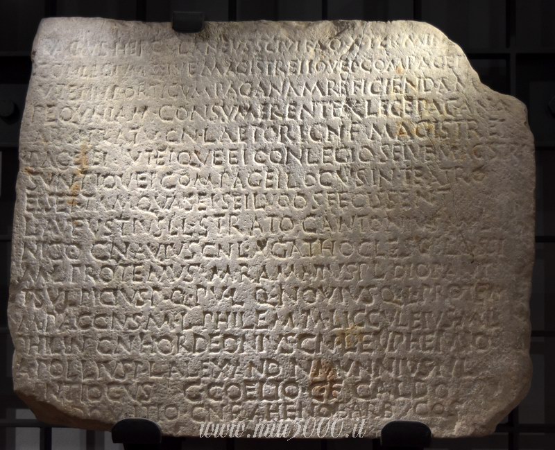 From the Samnite wars on (second half of the 4th century BC), Rome went through a great process of expansion, gaining military, political and economic hegemony over the rest of Italy and in the Mediterranean. This process resulted in a gradual Romanization - i.e. integration into the Empire - of the allied or subject populations. To exercise its hegemony, Rome availed itself of various means, such as the incorporation into its territory of other cities (municipia), the foundation of colonies, the concession of citizenship without the right to vote (civitas sine suffragio) and the concluding of bilateral treaties (foedera). The allied communities were, for the most part, subjected to Rome in their foreign policy, and were under the obligation to provide it with troops. They enjoyed, however, a certain degree of autonomy in their internal affairs. Although, especially from the 2nd century BC, the government of Rome often interfered heavily into the life of the individual communities, Romanization also took the form of a spontaneous phenomenon, because the allies looked up to the Roman model, benefited from Rome’s hegemony in the Mediterranean and, above all, their local elites wished to take part in the management of the Empire. The Romanization of Italy was by then essentially accomplished on the juridical plane. The epigraphic texts on exhibits in this room, most of which are from southern Italy, illustrate the different ways in which Rome managed its empire in the Republican age. They include judicial laws and municipal statutes (nos. 1, 5-6) and others illustrating the internal management of public administration in “Romanized” communities (nos. 3, 5) or providing examples of how Rome managed its relations with its overseas allies (no.3). The remaining epigraphs on exhibit also concern important aspects of the social life of Roman Italy.